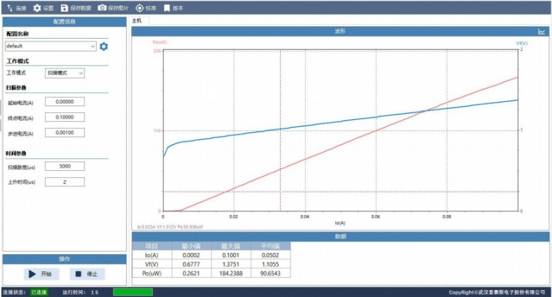 PLT系列大功率激光器测试恒流脉冲源适用于可见光、大功率BAR、VCSEL阵列等大功率激光器的测试,支持脉冲、直流PIV特性曲线扫描测试和特性参数计算,支持光谱特性测试(需要外接光谱仪)。仪表集脉冲电流源、电流表、电压表和光功率计等功能于一体,具有体积小、测试速度快、使用简单的特点。
